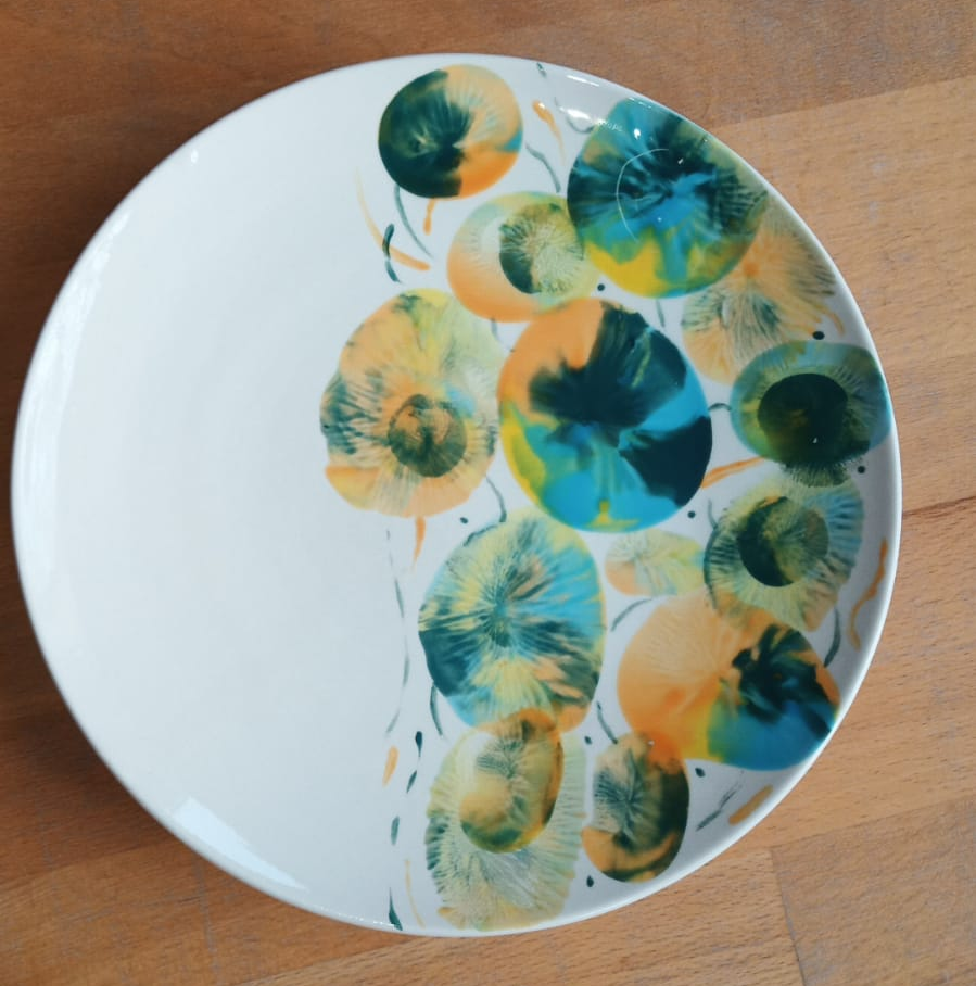 Eine einfache und besonders effektvolle Technik zum Bemalen der Keramik: Statt Pinsel kommen hier größere und kleinere Ballons zum Einsatz. Wenn man gerade keine Luftballons zur Hand hat, lassen sich diese z.B. auch aus Einmal-Handschuhen fertigen. Dann gehts los - Farbe auf einen flachen Teller arrangieren, so wie ihr es schön findet , Ballon eintauchen und auf die Rohkeramik stempeln. Bei der Anordnung könnt ihr der Fantasie freien Lauf lassen, einfach Mut haben und ausprobieren - es ergeben sich wie von selbst wunderschöne Muster! Wer möchte kann zum Schluß noch mit dem Pinsel, Schwamm etc. noch Akzente setzen. Viel Spaß beim nachmachen.... weitere Beispiele seht ihr hier ..